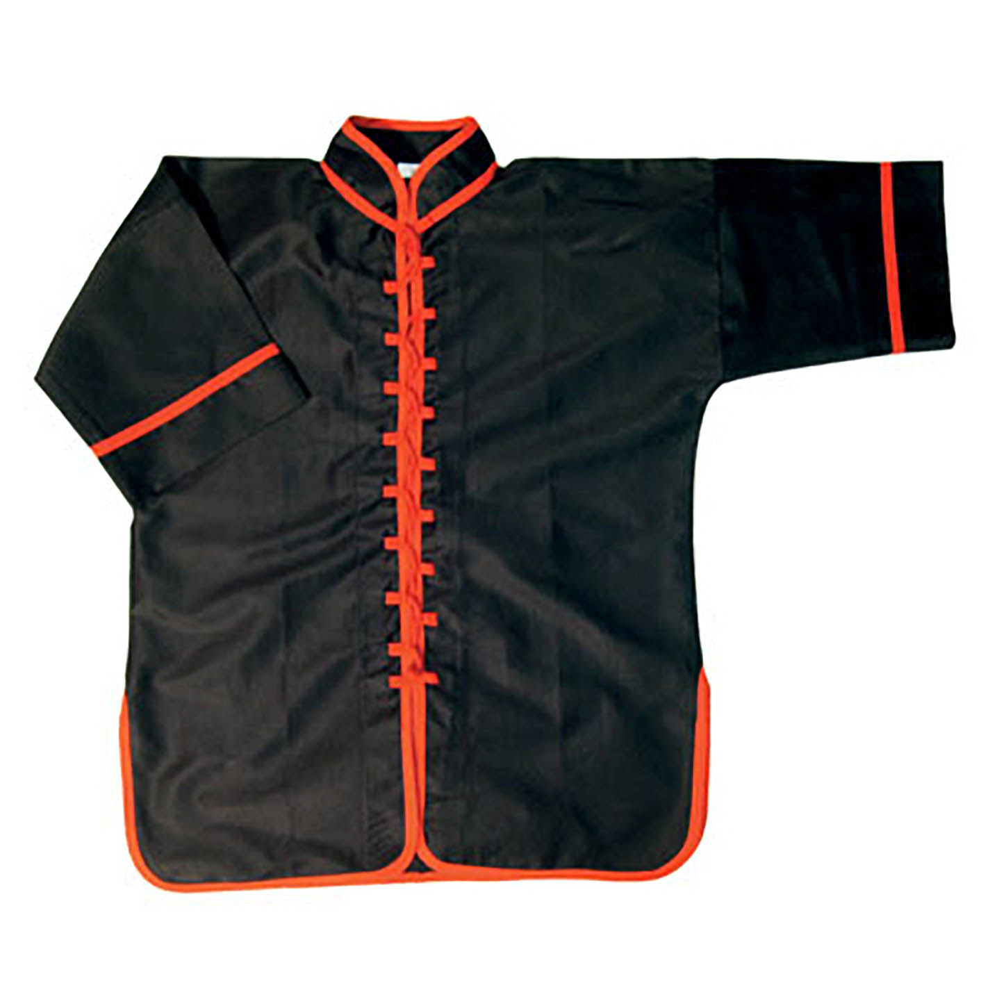 The traditional Kung Fu uniform in classic black with red trim! This uniform design is the favorite among traditional stylists, especially in southern China. Authentic mandarin collar and interloop knot closure, reinforced for durability. Poly/cotton blend. The customary half-sleeve cut leaves the forearms ready for sparring practice.